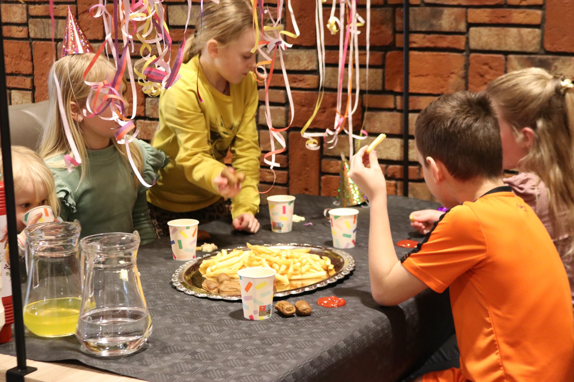 Je start je feestje aan een versierde tafel om daarna de activiteiten te starten. Met de keuze/combinatie uit Dans , Klauteren, Spelletjes en Knutselen en als afsluiting eten we frietjes en snacks. (Tijdens het gehele feestje zal er drinken zijn).